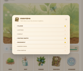 Flutterjar is a cozy terrarium game about caring for tiny bugs and watching them live their quiet little lives.