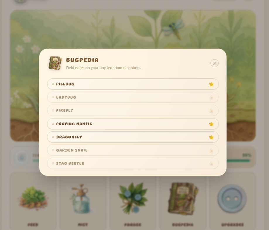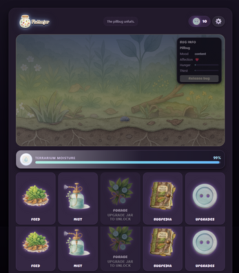 Feed them, keep the jar healthy, send them on gentle foraging trips, and slowly build a peaceful ecosystem — no stress, no timers, no failure.